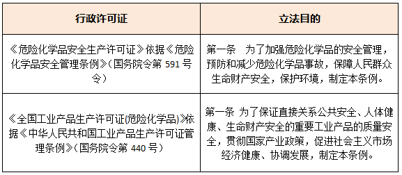 《危险化学品安全生产许可证》依据《危险化学品安全管理条例》(国务院令第591号令)办理,《全国工业产品生产许可证(危险化学品)》依据《中华人民共和国工业产品生产许可证管理条例》(国务院令第440号令)办理。